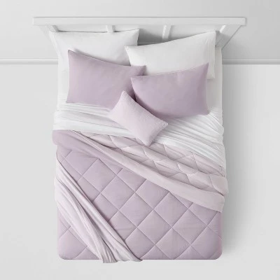 Adorn your sleep space with this Solid Microfiber Reversible Decorative Bed Set with Throw from Room Essentials™. This comforter bedding set featuring a quilted diamond pattern revives your bedroom style with a blend of modern texture and comfort. Including matching sham(s) with envelope closure, one decorative pillow, microplush throw and a comforter, this complete bedding set is easy to coordinate. The faux-fur pillow with microsuede reverse adds a layer of soft texture, while the comforter and sham in brushed microfiber lend cozy warmth as you lie down or recline in bed. Plus, the set is simply machine washable for easy home care.
